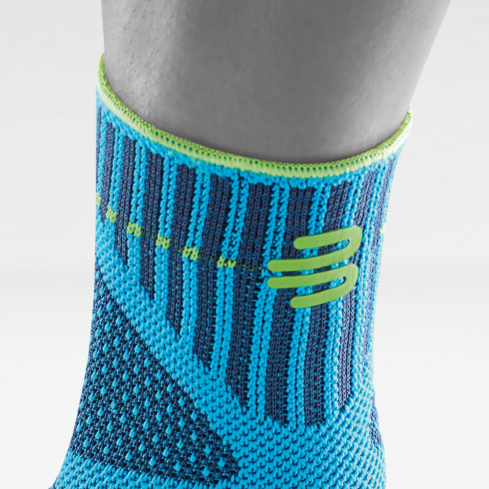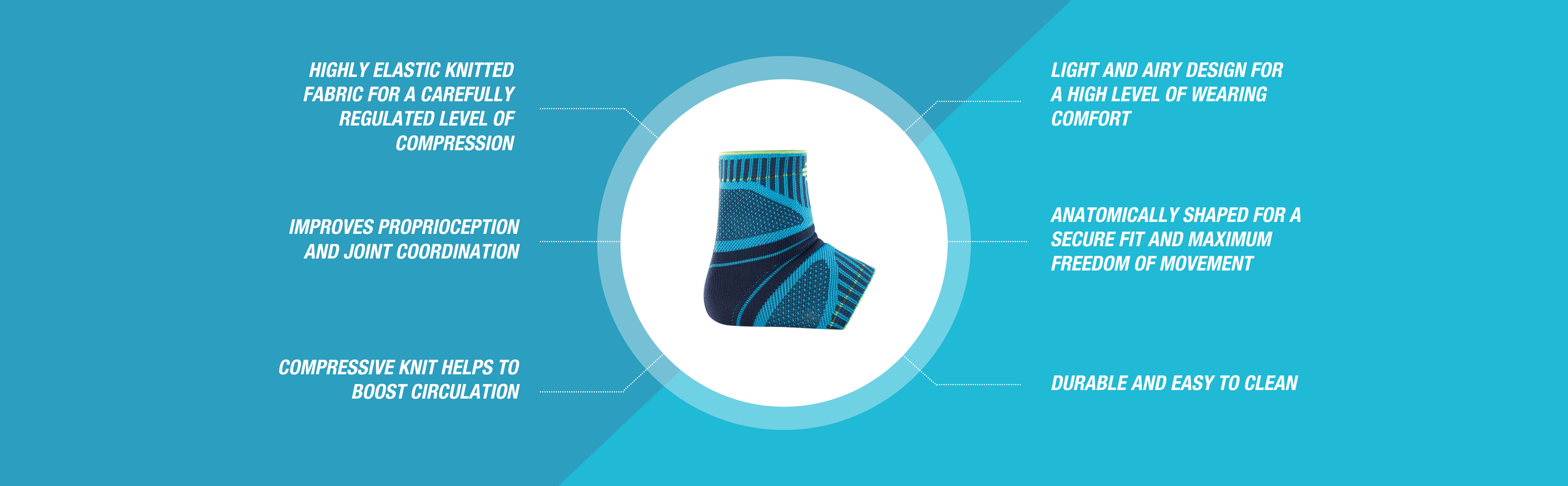 The clinically proven design of the Sports Ankle Support Dynamic provides active support to the ankle during movement. Its innovative compressive knit material boosts positive sensorimotor feedback, enhances blood circulation, and stimulates metabolism. This design helps reduce ligament strain, activates the foot's stabilizing muscles more quickly, and greatly improves joint coordination.