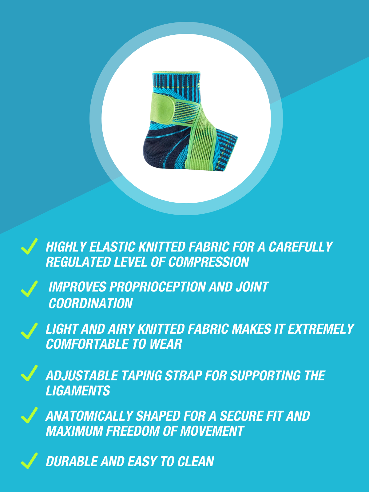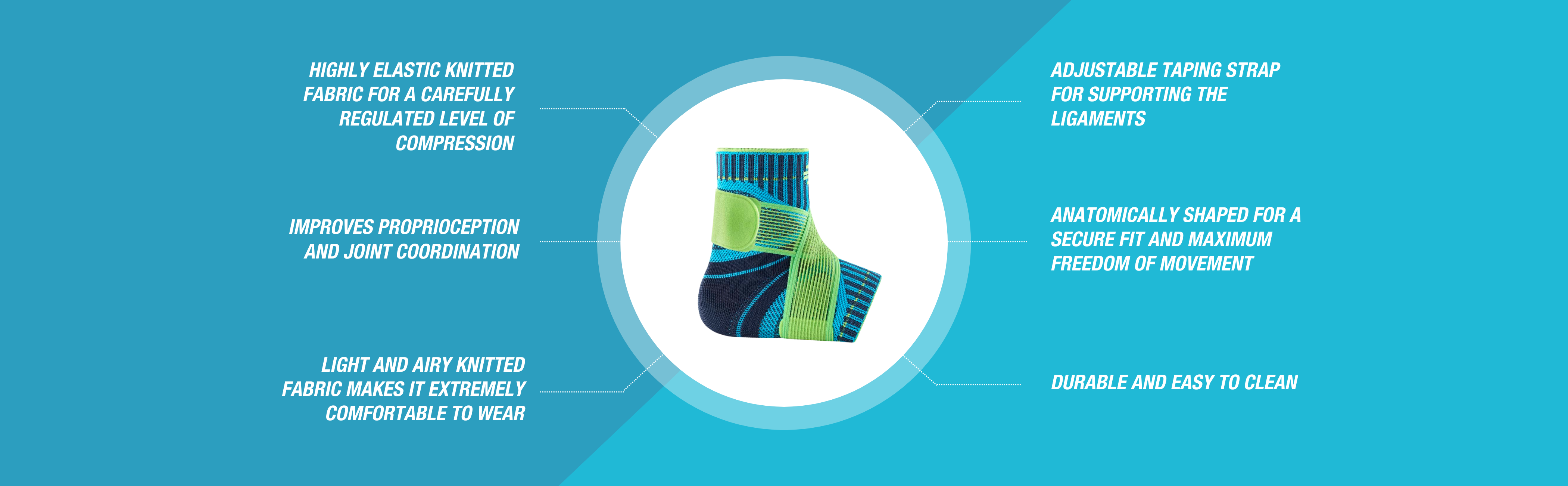 The Sports Ankle Support features targeted compression and an integrated figure-8 taping strap. The adjustable strap ensures superior ankle support that outlasts that of conventional taping. The breathable, durable knitted fabric gently massages the tissue during movement, stimulating circulation and metabolism for enhanced recovery.