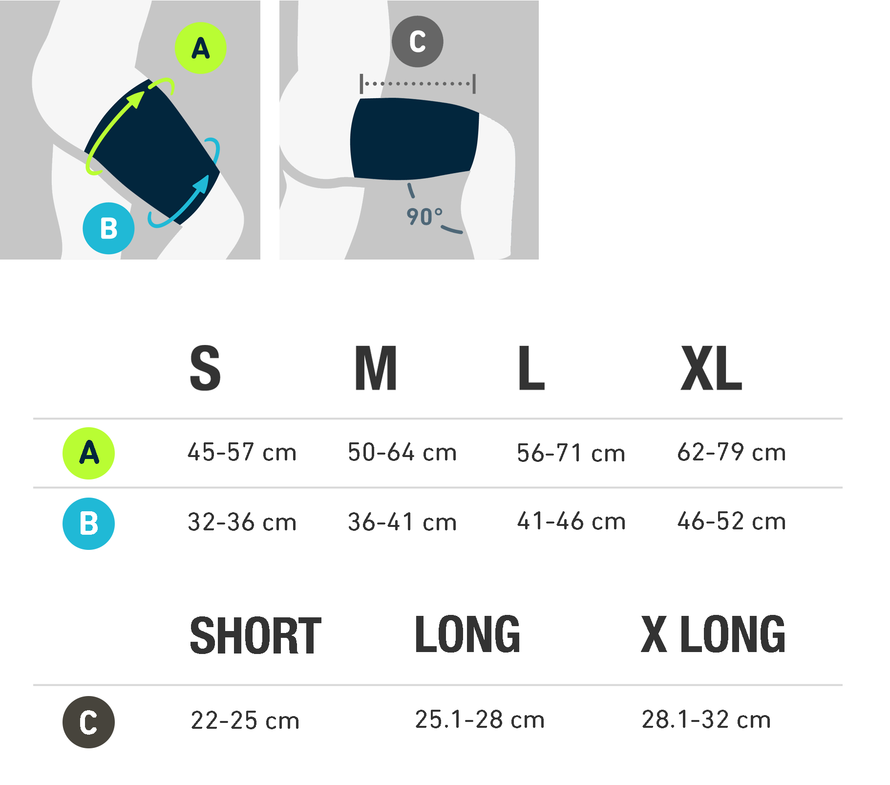 If your measurements (A, B) are between two sizes, please choose the smaller one. If your measurements are in length (C), please choose the longer version.