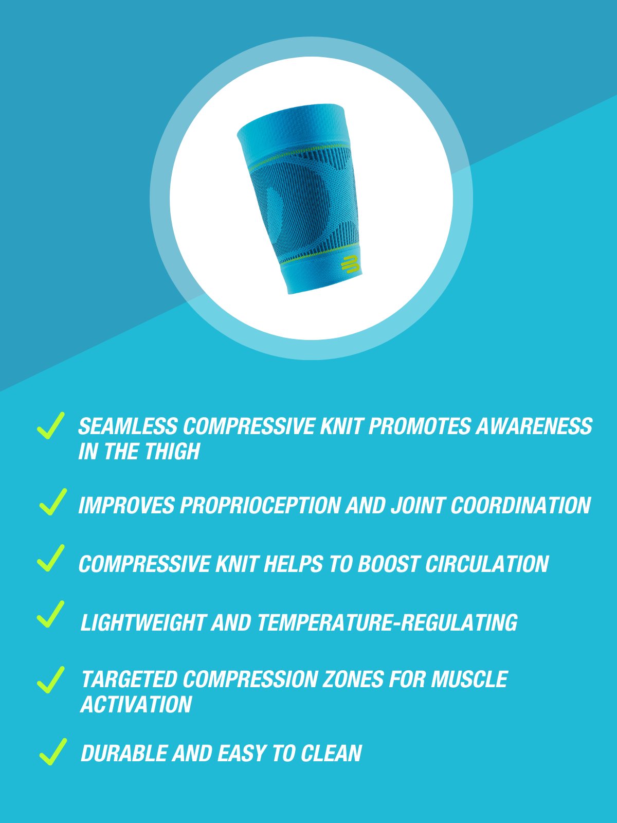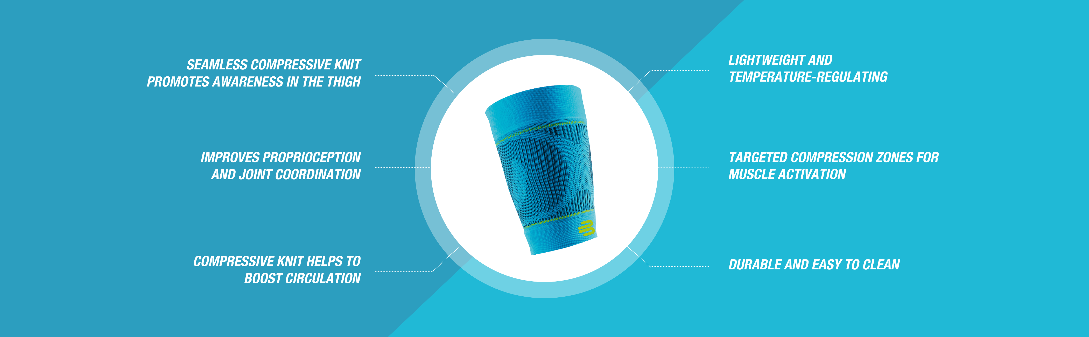 The Sports Compression Thigh Sleeves activate the thigh muscles with medically proven graduated compression.The muscles receive a better supply of oxygen, perform more effectively and regenerate faster. The graduated compression also reduces uncomfortable muscle vibrations in the thighs, thus preventing premature fatigue.